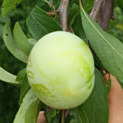 紫云冰脆李果形近圆型,果顶微凹,近缝合线斜凸,缝合线浅,果皮黄绿色,外披果粉,果肉黄绿色,内质酥脆,味甜,无苦涩味,离核。